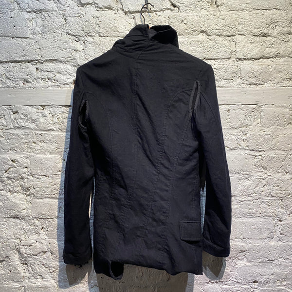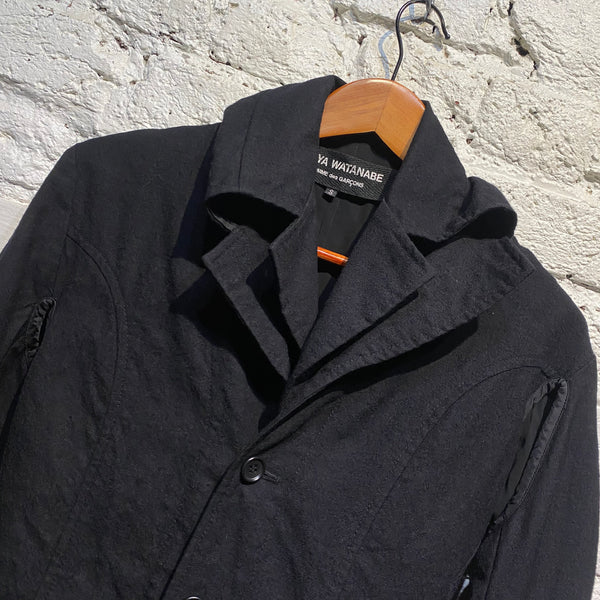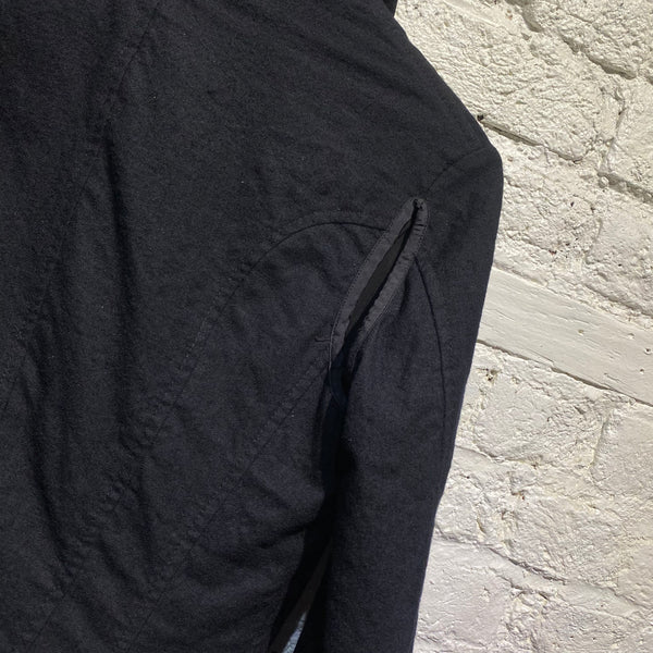 JUNYA WATANABE COMME DES GARÇONS BLACK BOILED WOOL WITH CHIFFON LINING ASYMMETRICAL BUTTONED LONG SLEEVE JACKET